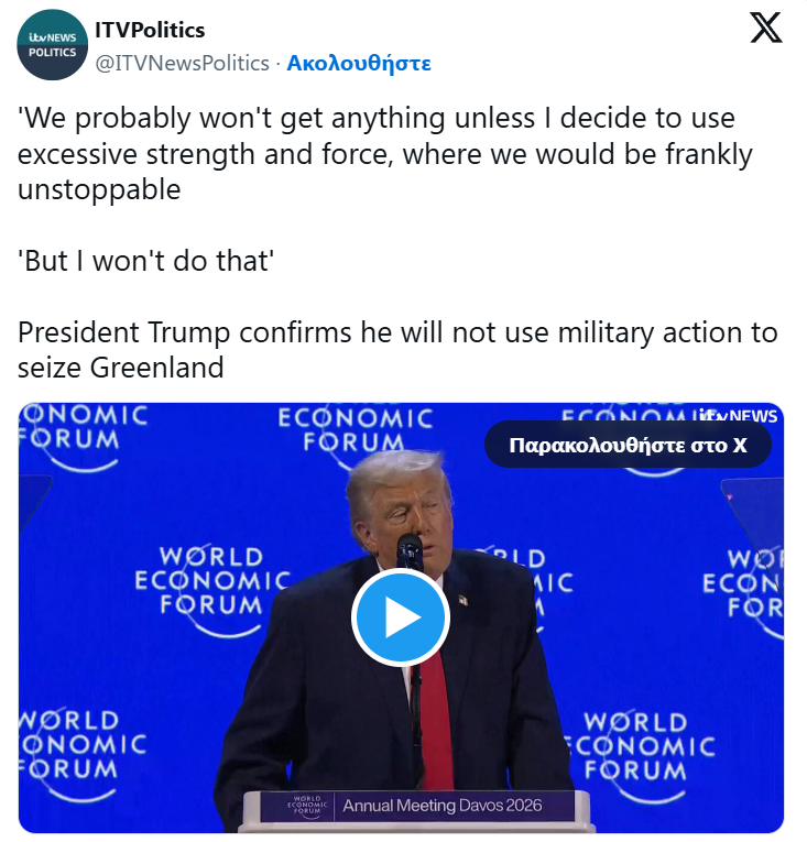 «Αυτή η λύση, αν ολοκληρωθεί, θα είναι εξαιρετική για τις Ηνωμένες Πολιτείες της Αμερικής και για όλα τα κράτη του ΝΑΤΟ. Βάσει αυτής της κατανόησης, δεν θα επιβάλω τους δασμούς που είχαν προγραμματιστεί», έγραψε ο Αμερικανός πρόεδρος στην ανάρτησή του, ενώ προηγουμένως είχε αναφέρει στην ομιλία του ότι (τελικά) δεν προτίθεται να χρησιμοποιήσει στρατιωτική ισχύ για την απόκτηση της Γροιλανδίας.