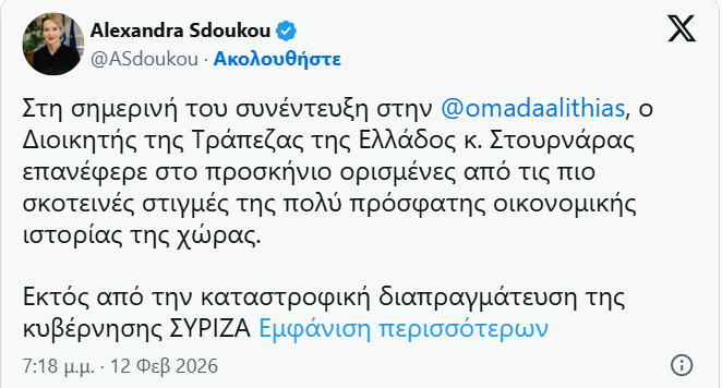 «Στη σημερινή του συνέντευξη στην @omadaalithias , ο Διοικητής της Τράπεζας της Ελλάδος κ. Στουρνάρας επανέφερε στο προσκήνιο ορισμένες από τις πιο σκοτεινές στιγμές της πολύ πρόσφατης οικονομικής ιστορίας της χώρας.
