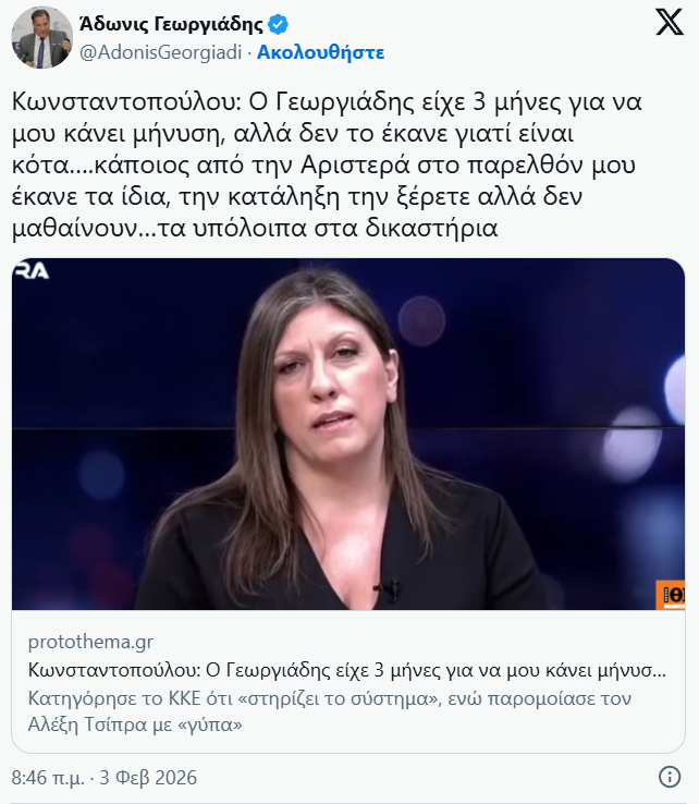 Από την πλευρά του ο υπουργός Υγείας με ανάρτησή του στο Χ το πρωί της Τρίτης υπενθύμισε ότι «κάποιος από την Αριστερά στο παρελθόν μου έκανε τα ίδια, την κατάληξη την ξέρετε αλλά δεν μαθαίνουν…». «Τα υπόλοιπα στα δικαστήρια» καταλήγει στην ανάρτησή του ο κ. Γεωργιάδης.